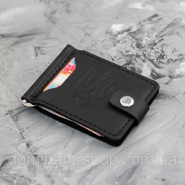 Затискач для грошей і карток на кнопці з тиснення герб України з натуральної шкіри crazy horse в чорному кольорі Veres Black. Тримач для купюр шкіряний